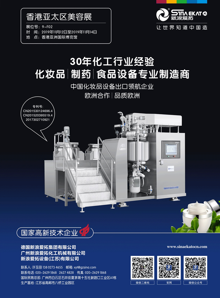 【Sina aituo chemical machinery equipment】Participate in this exhibition and meet you at booth 9-f02. Sina Alto is a cosmetics machinery and equipment manufacturing company with 30 years of equipment production experience. The whole line is provided with vacuum homogenization emulsifier, water treatment, filling machine, labeling machine, stainless steel tank, etc. all of them are available. Welcome to Sina Alto official website for more details!
